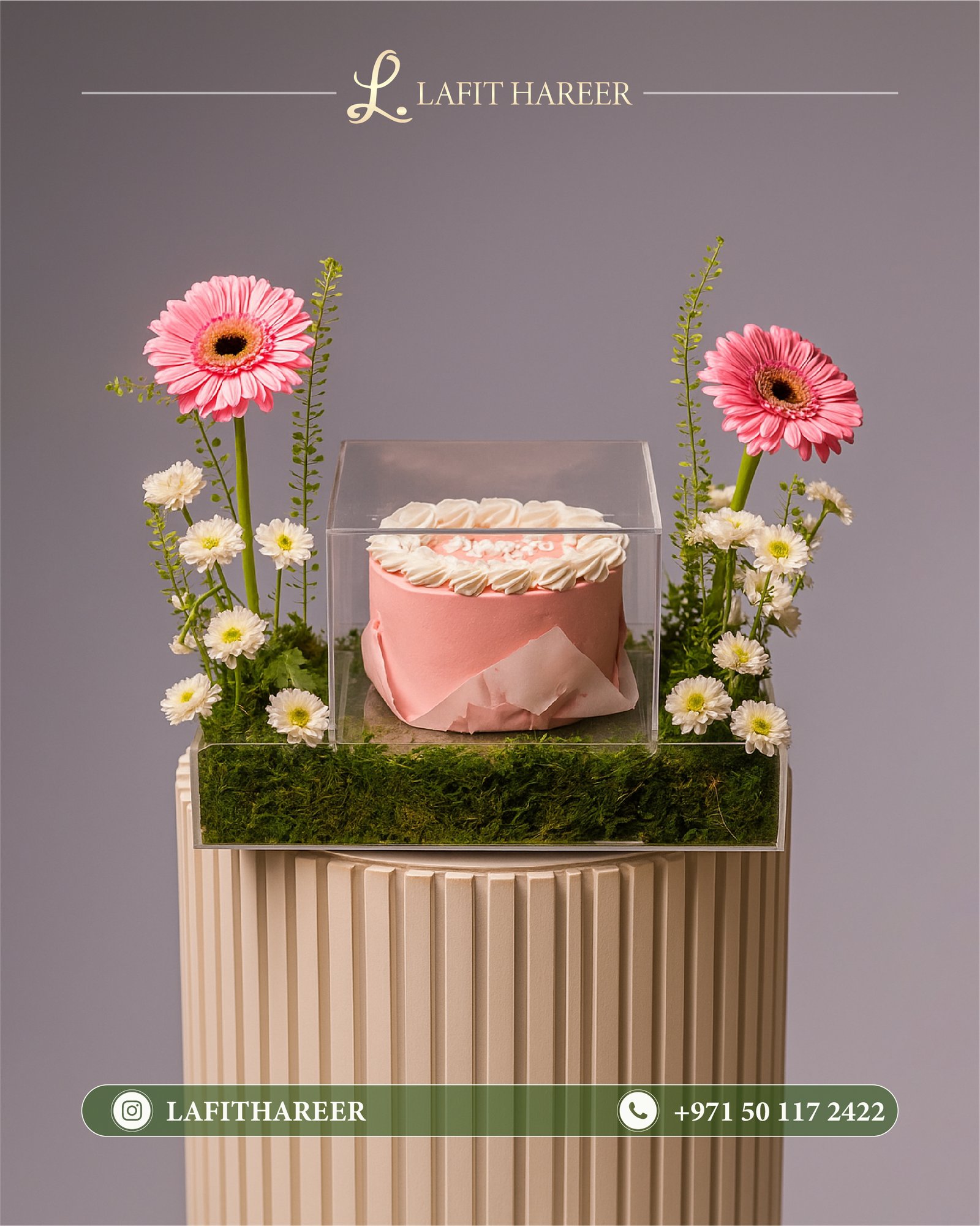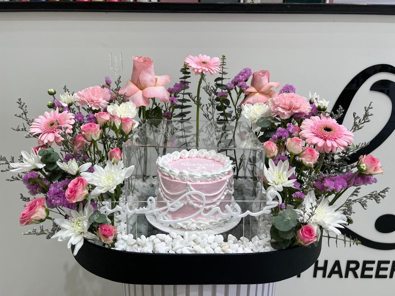 كيكة ورديه مع زهور بيضاء